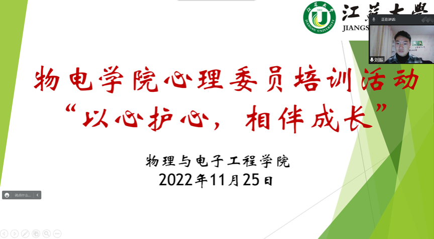 11月25日,为充分发挥班级心理委员的心理健康知识普及、提升心理委员自身素质,女上位 线上通过腾讯会议举办“以心护心,相伴成长”主题培训。培训会由刘振主持,全体心理委员参加。