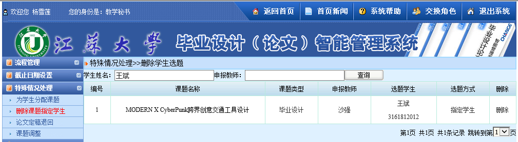 教学秘书权限下,特殊情况处理-》删除课题指定学生