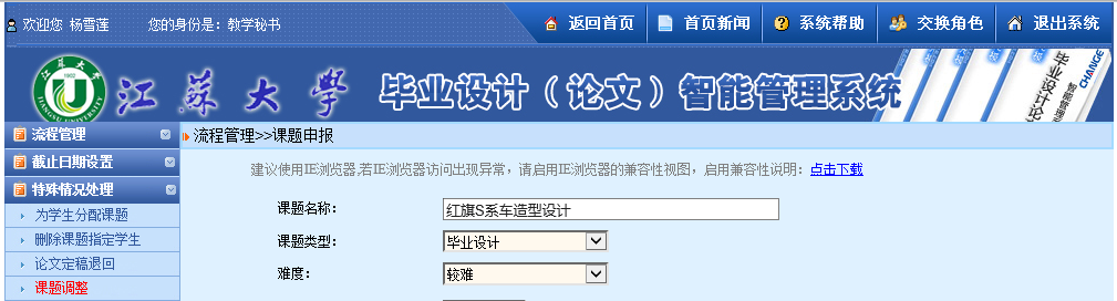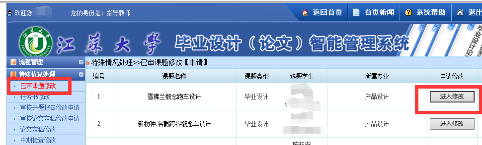 修改完毕后点提交,待毕设专业审核人(在特殊情况处理-》审核教师课题修改)审核通过后,新课题内容生效。