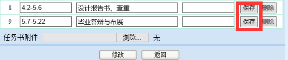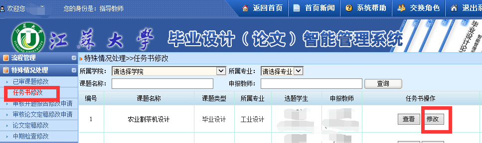 调整完毕,点击修改,待毕设专业审核人(在特殊情况处理-》任务书修改审批)审核通过后,新任务书生效。