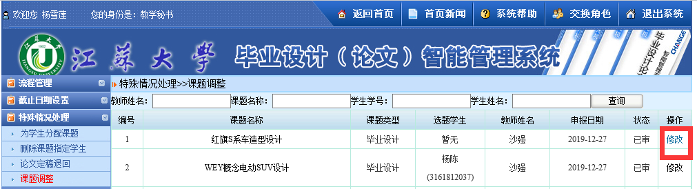 教学秘书或毕设审核人权限,特殊情况处理-》课题调整,找到课题点击“修改”按钮