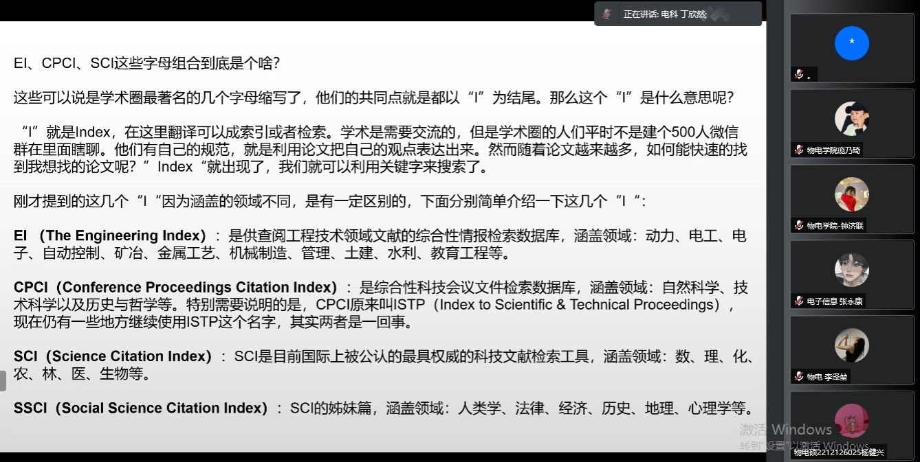 接着,丁欣然同学分享了她的科研经验:补充介绍了文献分类,详细讲述了如何根据自己的研究方向查询研究热点和学术领军任务。她还贴心的向大家阐述如何从“学术小白”如何变身“学术大咖”的快速成长方法。