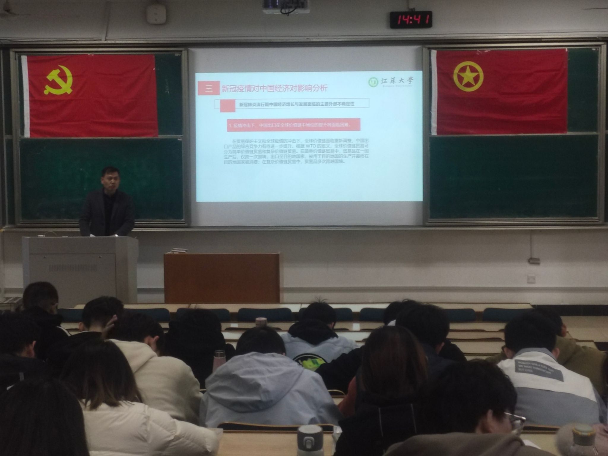 首先,潘书记向同学们讲述了疫情大背景下世界各国的应对措施;而后,潘书记介绍新冠肺炎疫情冲击下的中国宏观经济走势,展示了虽受疫情冲击,但中国的经济仍稳步发展的现状;之后,向大家讲述了在抗击疫情的这段岁月中,中国为世界经济发展做出的伟大贡献,并讲述了作为大学生的我们能为中国的经济发展做出什么样的贡献;最后,潘书记呼吁同学们要多加关心国家时事,思考身为青年人的我们如何为国家奉献青春力量。